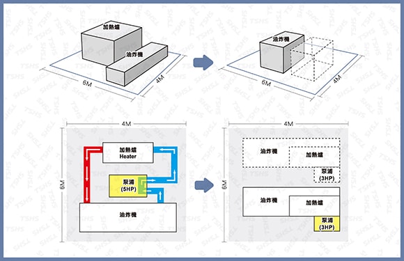 3 Savings: Space saving, oil capacity saving and energy saving. Space Saving: Tsung Hsing's original patented invention integrates the original external heating chamber into the fryer Thus the whole production line saves up to 40% of the floor space.